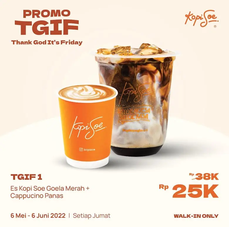 TGIF 1 : Es Kopi Soe Goela Merah + Cappucino Panas 25K TGIF 2 : Es Thai Tea + Cappucino Panas 23K TGIF 3 : 1 Croffle 16K/19K